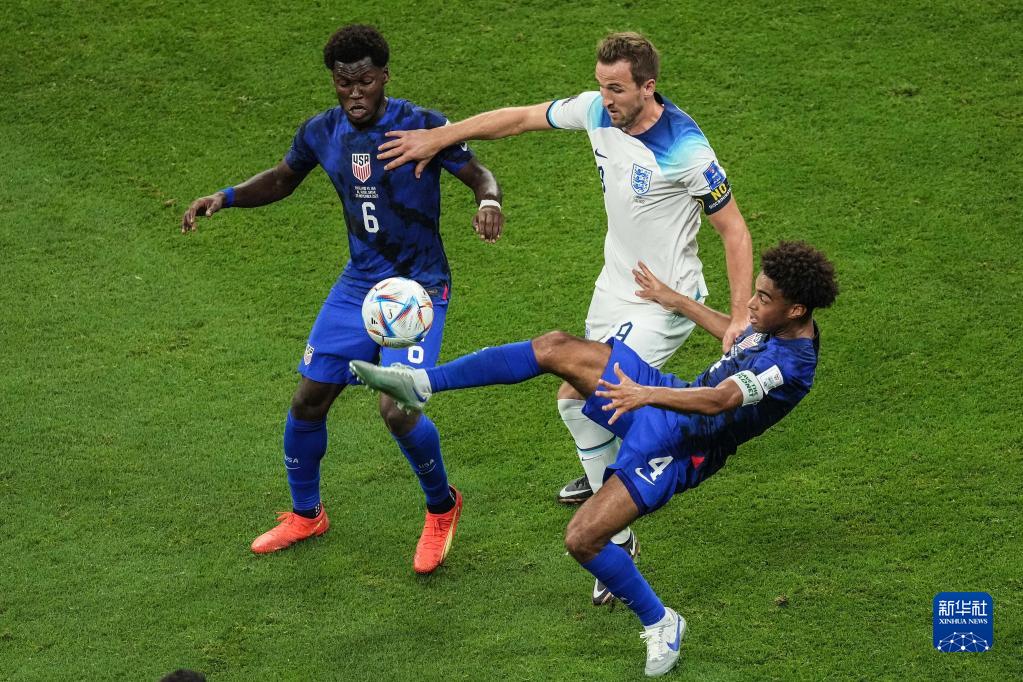 11月25日,英格蘭隊球員凱恩(中)與美國隊球員泰勒·亞當斯(右)、尤努斯·穆薩在比賽中拼搶。