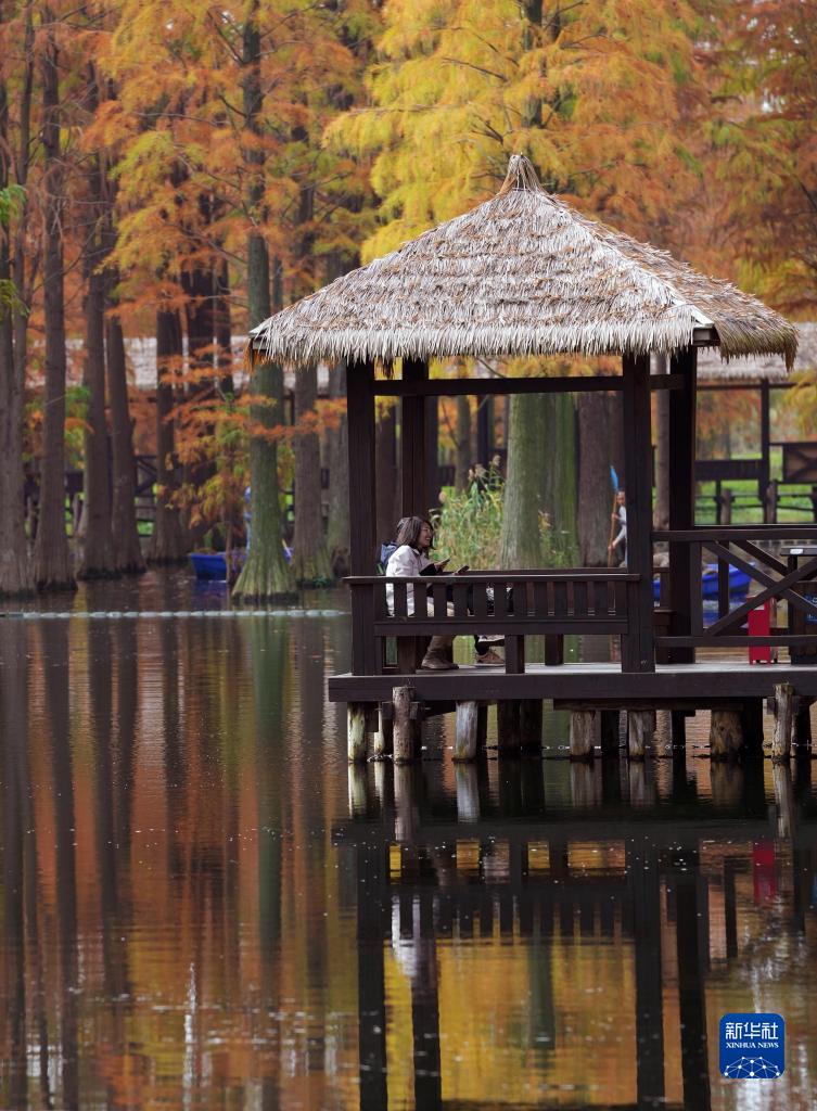 近日,上海青西郊野公園“水上森林”的水杉、池杉、落羽杉等枝頭盡染,風(fēng)景如畫。