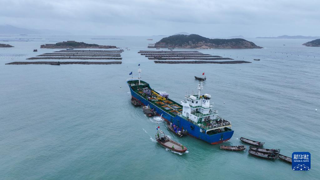 當日,福建福州連江縣苔菉鎮后灣海域熱鬧非凡,5萬多籠鮑魚從山東榮成乘船歸來,返回家鄉過冬。