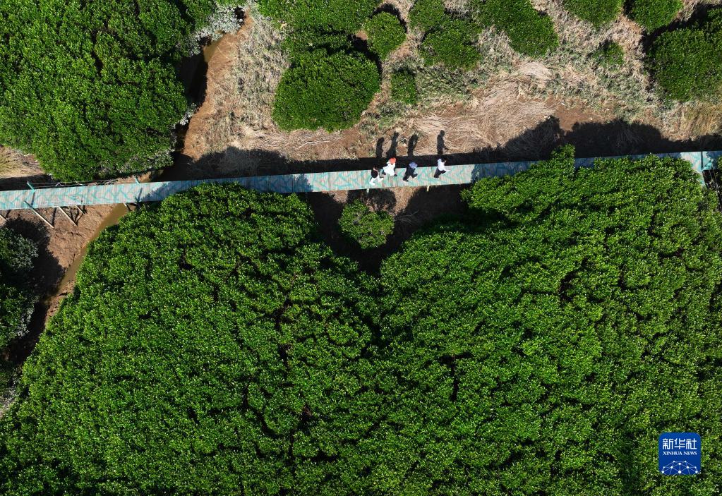張潮巨和同事在閩江河口濕地核心區域觀測紅樹林的生長狀況(11月19日攝,無人機照片)。