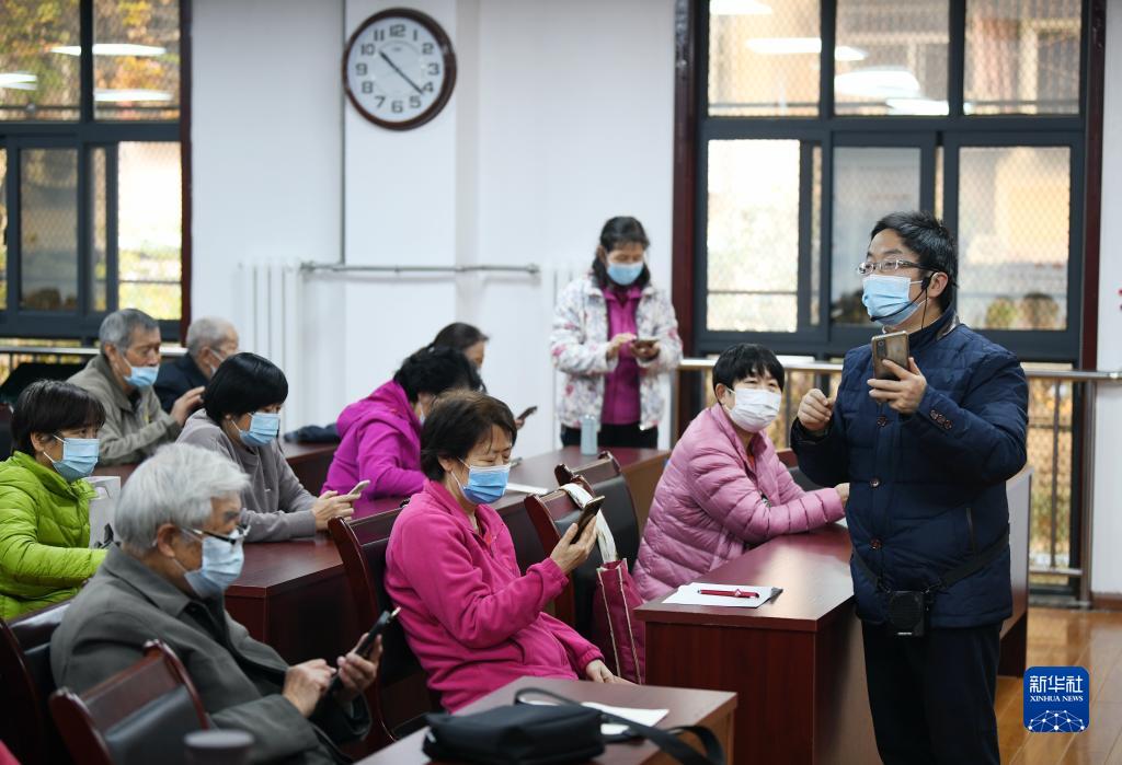 11月17日,在西安市雁塔區(qū)電子城街道二〇五所社區(qū),社區(qū)科普大學(xué)老師(右一)為社區(qū)居民講授手機(jī)視頻剪輯課程。