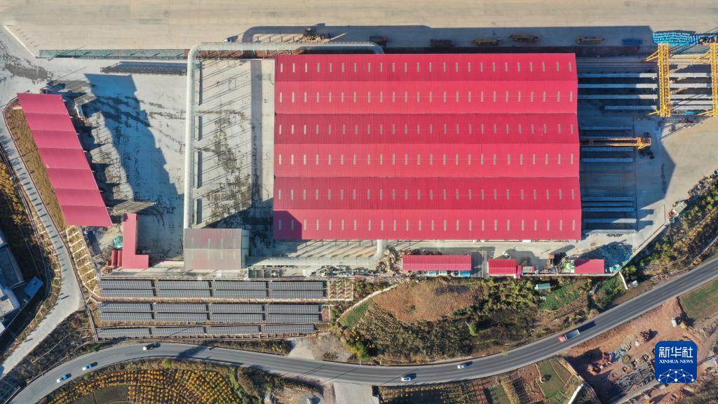 這是11月25日拍攝的“智慧梁廠”,高速公路邊坡上搭建的太陽能充電板可為廠內設施設備充電儲能(無人機照片)。