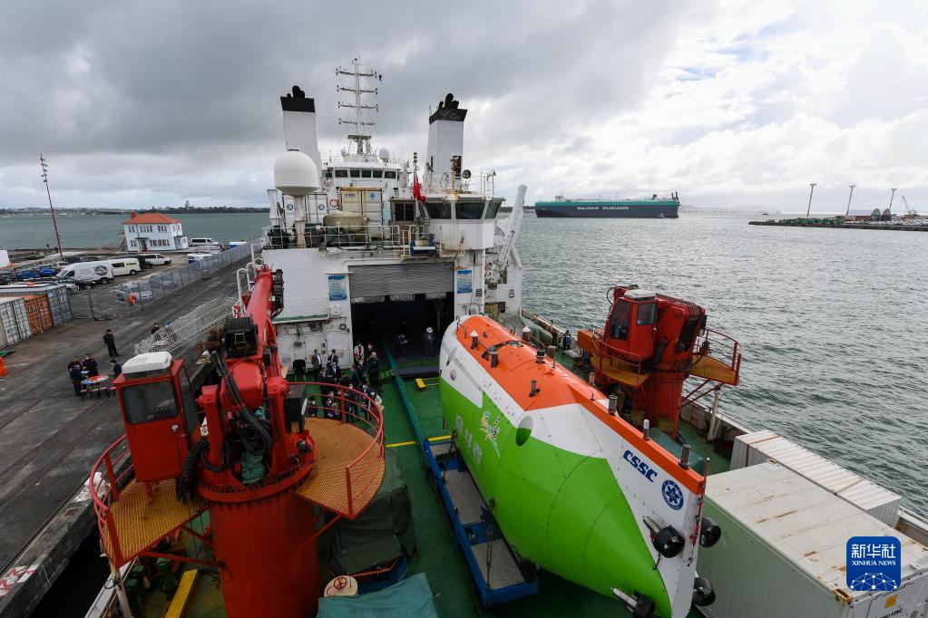 11月27日,中國“探索一號”科考船搭載著“奮斗者”號全海深載人潛水器停靠在新西蘭奧克蘭皇后碼頭。