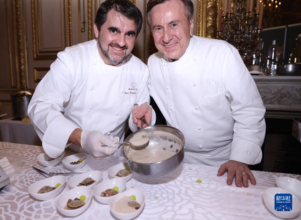 11月28日,在位于巴黎的法國外交部舉行的榜單揭曉活動現場,廚師展示其制作的美食——松露餃子。