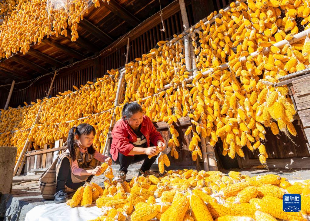 初冬時節,福建省漳州市南靖縣梅林鎮梅林村迎來玉米收獲季,村民們趁著晴好天氣晾曬玉米。近年來,南靖縣梅林鎮發揮地理優勢,大力推廣玉米種植,以產業興旺帶動鄉村振興。