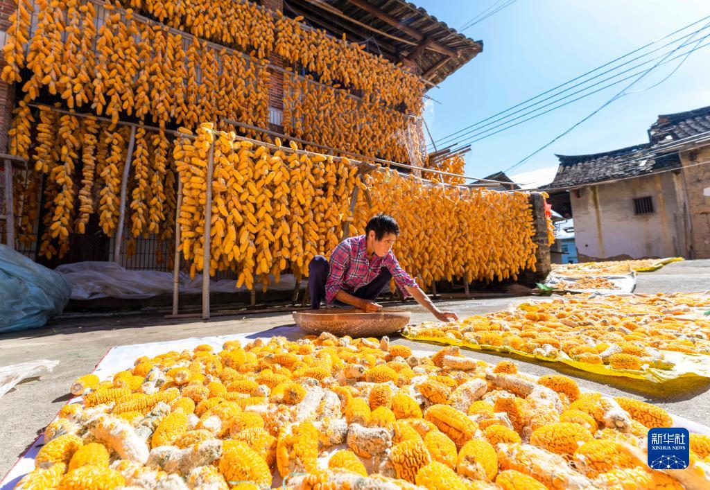 初冬時節,福建省漳州市南靖縣梅林鎮梅林村迎來玉米收獲季,村民們趁著晴好天氣晾曬玉米。近年來,南靖縣梅林鎮發揮地理優勢,大力推廣玉米種植,以產業興旺帶動鄉村振興。