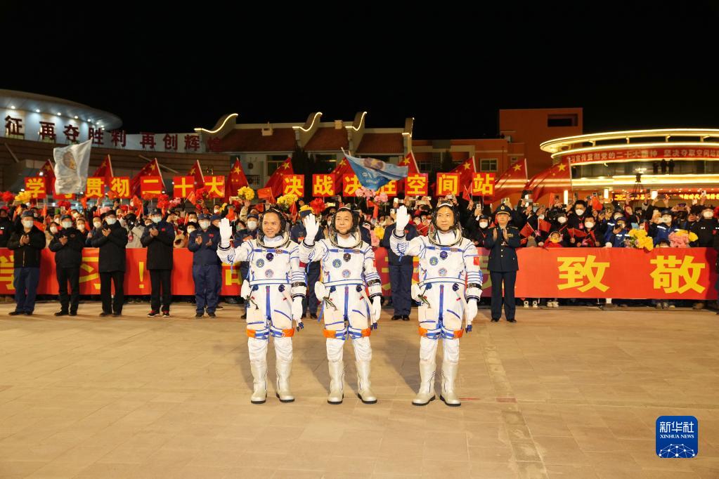 據中國載人航天工程辦公室消息,11月29日20時18分,神舟十五號載人飛行任務航天員乘組出征儀式在酒泉衛星發射中心問天閣圓夢園廣場舉行。航天員費俊龍(右)、鄧清明(中)、張陸在出征儀式上。