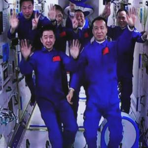 11月30日在酒泉衛星發射中心拍攝的神舟十五號航天員乘組與神舟十四號航天員乘組向全國人民揮手致意的畫面。