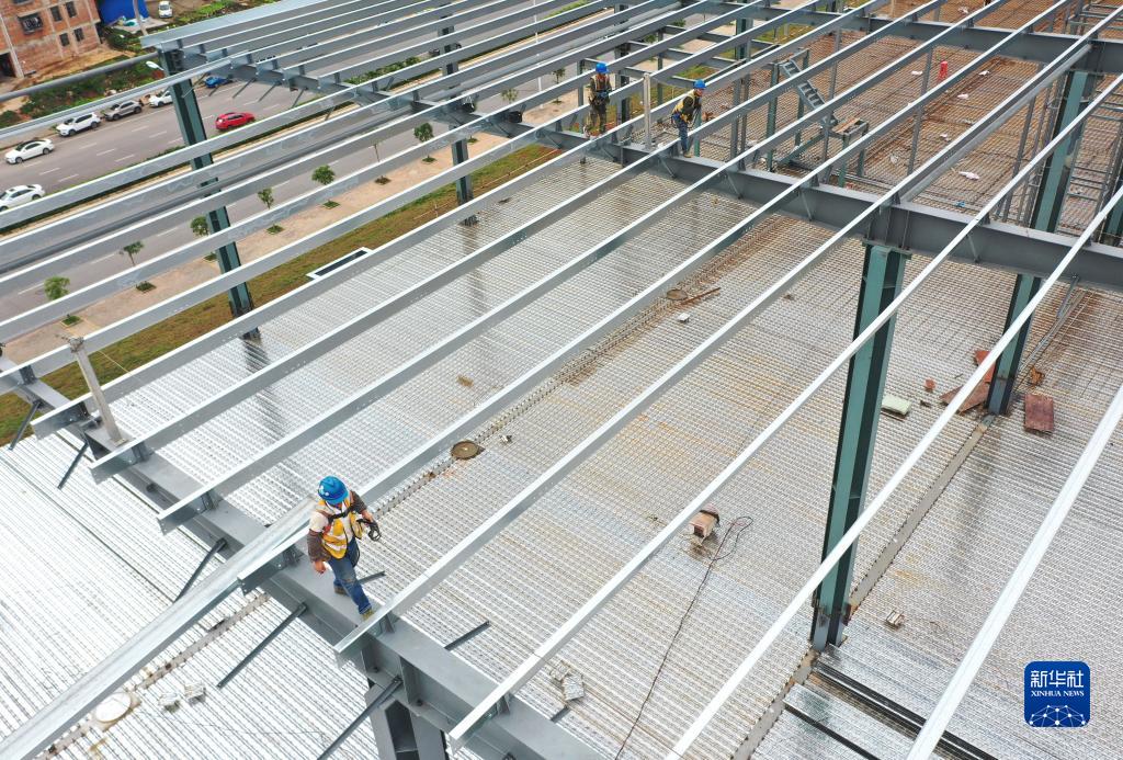 工人在中新南寧國際物流園的電商物流園進行頂棚施工(11月29日攝,無人機照片)。