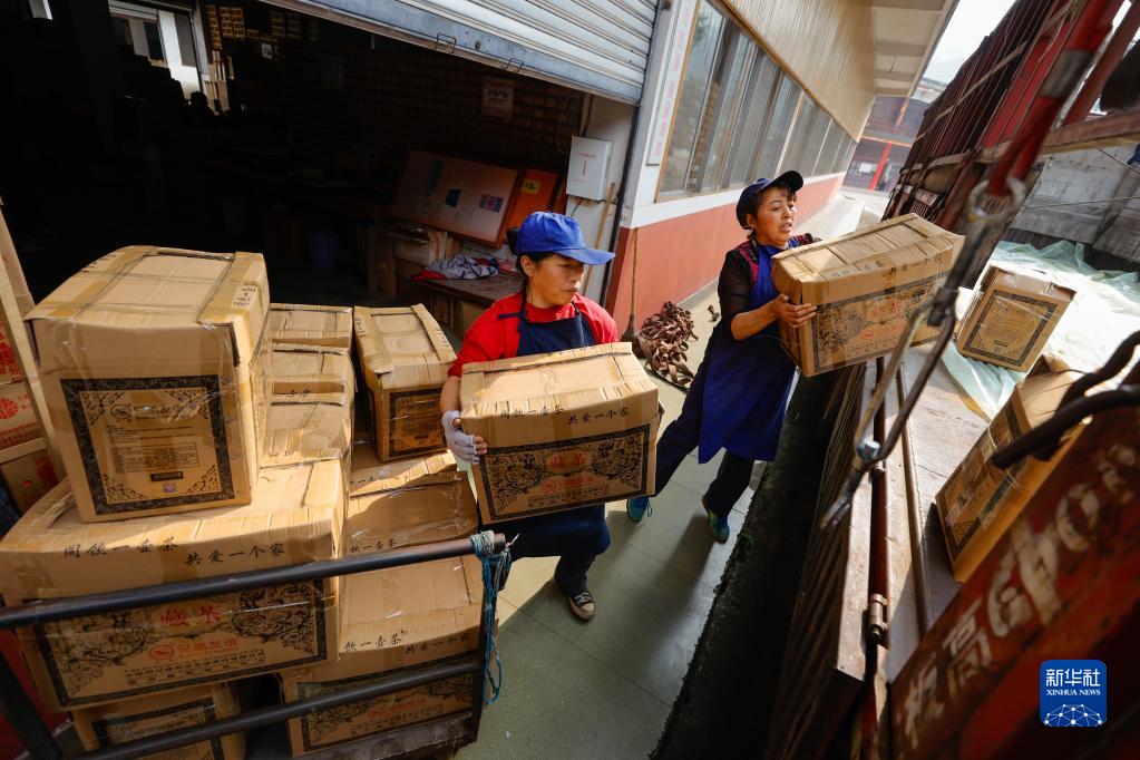 四川省雅安市友誼茶葉有限公司的工人將運(yùn)往西藏拉薩的“藏茶”產(chǎn)品搬運(yùn)裝車(2022年11月24日攝)。