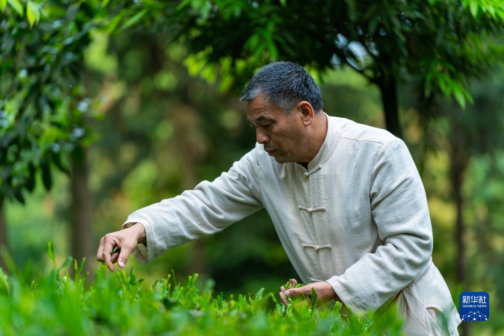 在四川省雅安市名山區的張氏祖屋附近,張躍華在采摘鮮葉(2022年3月31日攝)。蒙山茶產于四川省雅安市名山區境內的蒙頂山,是綠茶的一種。張躍華,生于1959年,是國家級非物質文化遺產代表性項目——綠茶制作技藝(蒙山茶傳統制作技藝)的代表性傳承人。張躍華自幼隨父親學習蒙山茶傳統制作技藝,是“張氏甘露”第五代傳人,他每年都要招收年輕徒弟,希望蒙山茶傳統制作技藝能世世代代傳承下去。