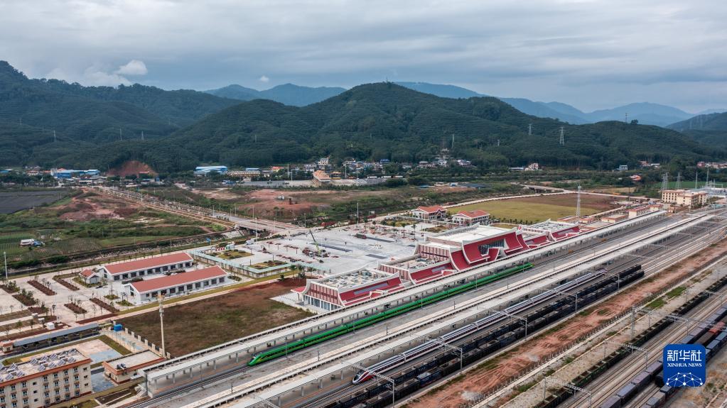 11月24日,“復興號”“瀾滄號”動車組停靠在中老鐵路磨憨站(無人機照片)。