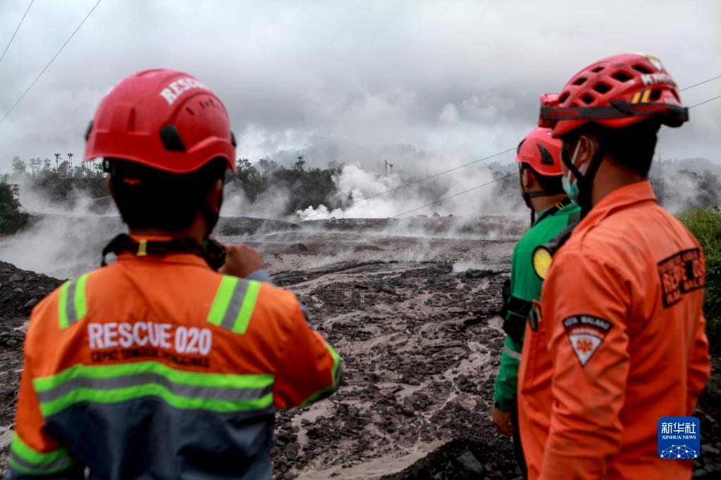 12月4日,在印度尼西亞東爪哇省盧馬姜的薩皮圖朗村,救援人員查看塞梅魯火山噴發后的受影響區域。