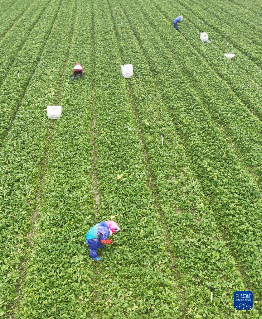 12月4日,在湖南省永州市道縣清塘鎮(zhèn)室家村,村民在蔬菜基地采摘蔬菜(無人機(jī)照片)。