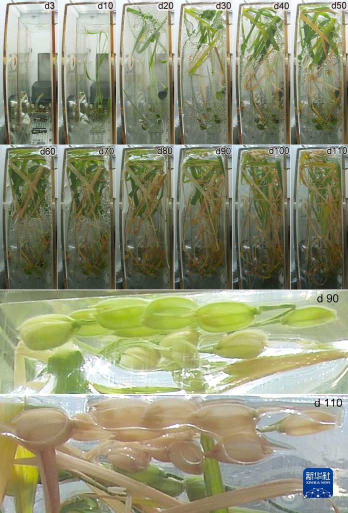 這是水稻在問(wèn)天艙生命生態(tài)實(shí)驗(yàn)柜通用生物培養(yǎng)模塊中完成“從種子到種子”全生命周期不同發(fā)育階段的代表性圖片,圖像上的數(shù)字表示注入營(yíng)養(yǎng)液?jiǎn)?dòng)實(shí)驗(yàn)后的天數(shù)。
