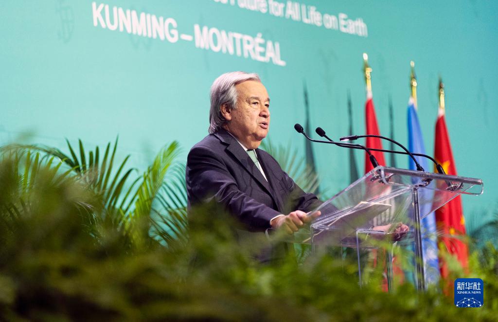 12月6日,在加拿大蒙特利爾,聯合國秘書長古特雷斯在《生物多樣性公約》第十五次締約方大會(COP15)第二階段會議開幕前夕的歡迎儀式上講話。