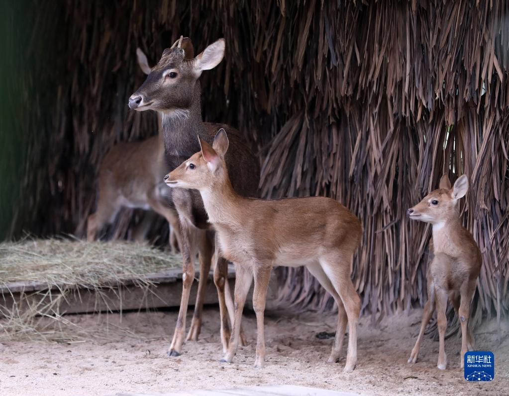 當日,廣州長隆野生動物世界成功繁育的兩頭國家一級保護動物海南坡鹿與游客見面。這兩頭海南坡鹿幼崽分別出生于2022年10月4日和22日,均為雄性。
