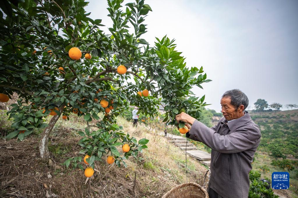 12月9日,在重慶市璧山區(qū)廣普鎮(zhèn)坪中村,村民在果園內(nèi)采摘臍橙。