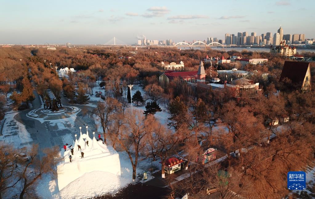 12月9日,雪雕師在哈爾濱太陽島雪博會園區進行雪雕創作(無人機照片)。