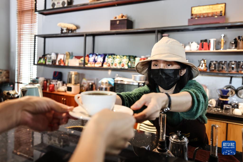 12月10日,在位于海南澄邁的才存咖啡館,咖啡師嚴(yán)春桂為顧客送上她制作的咖啡。