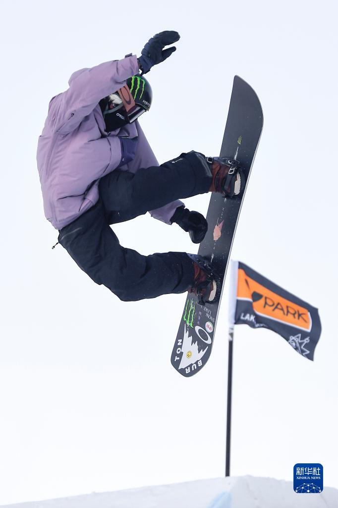 北京冬奧會單板滑雪男子大跳臺冠軍蘇翊鳴在V-PARK地形公園內高高躍起(12月10日攝)。