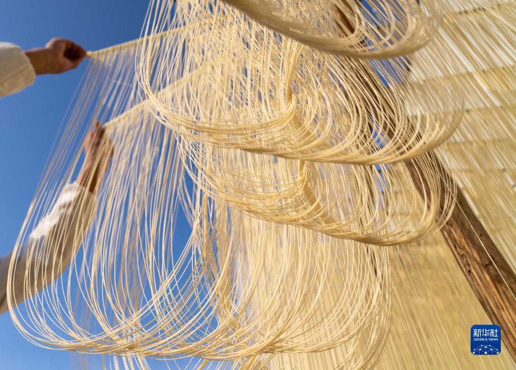 12月12日,在竹塘社區(qū)掛面合作社的掛面車間,工人將掛面上架晾曬。