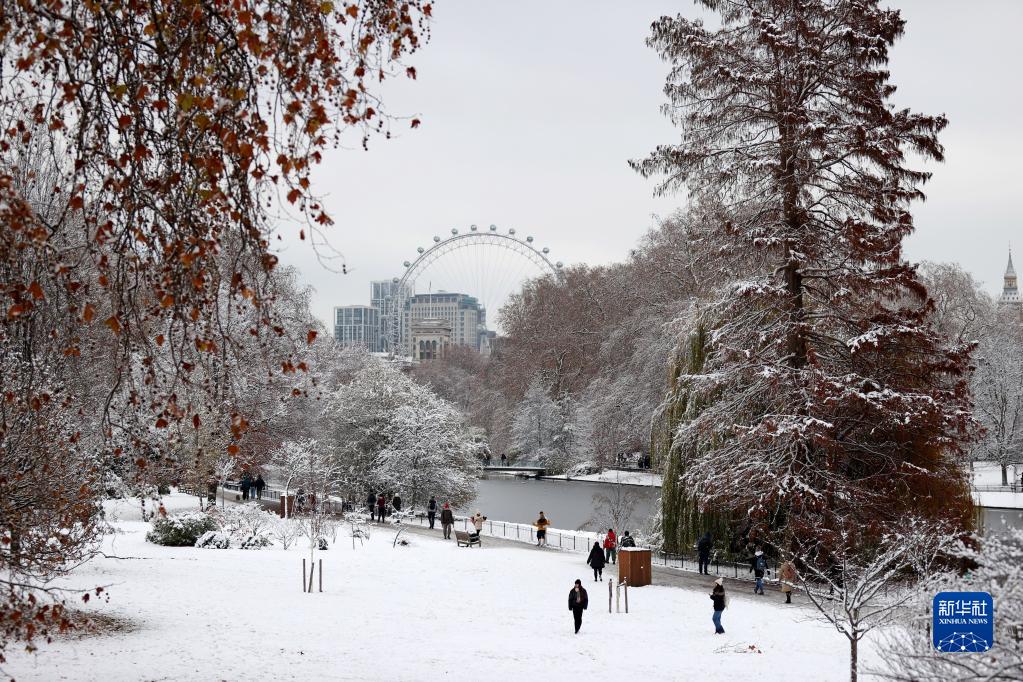 12月12日,人們在英國“倫敦眼”附近的雪地上行走。