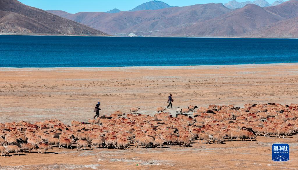 牧民在羊卓雍錯湖邊放羊(12月11日攝)。