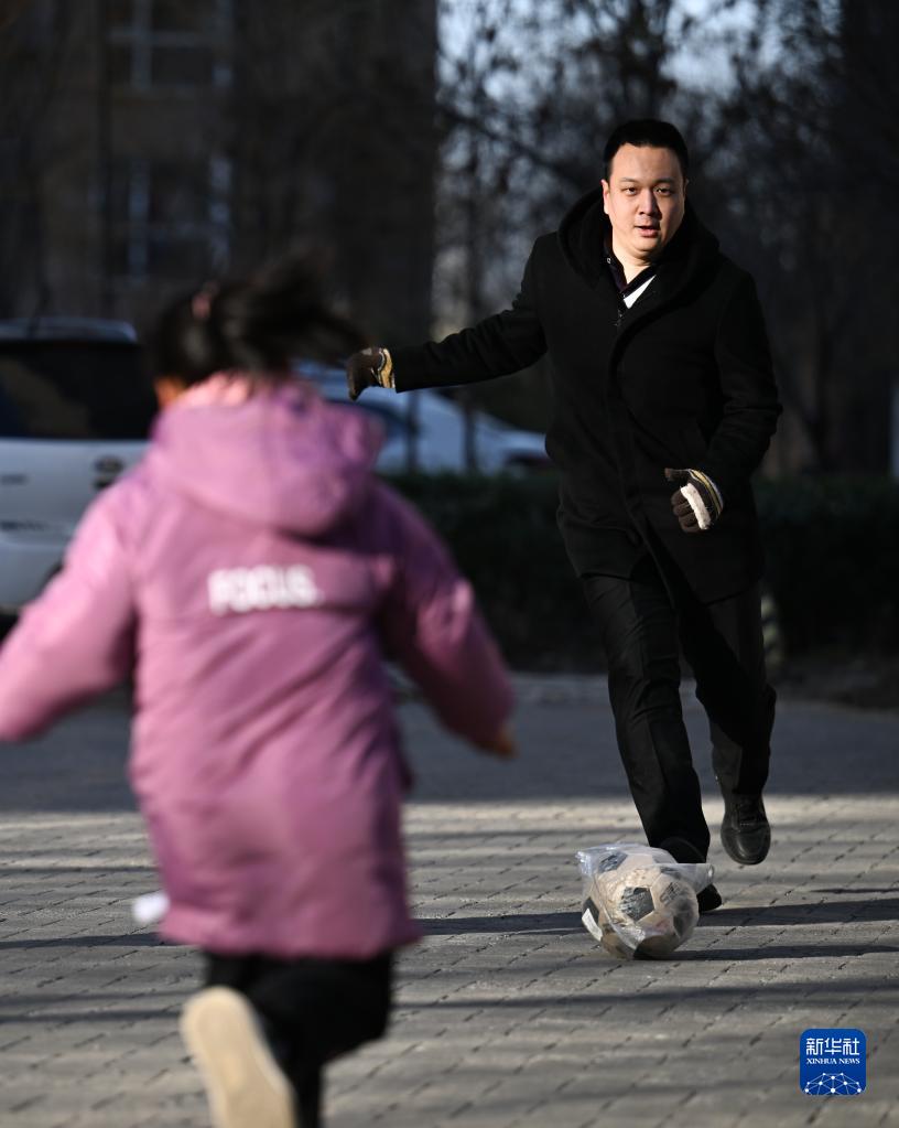 蔡成(右)與女兒在小區內踢足球,為了讓足球滾動起來有聲音,足球被套上了塑料袋(12月1日攝)。
