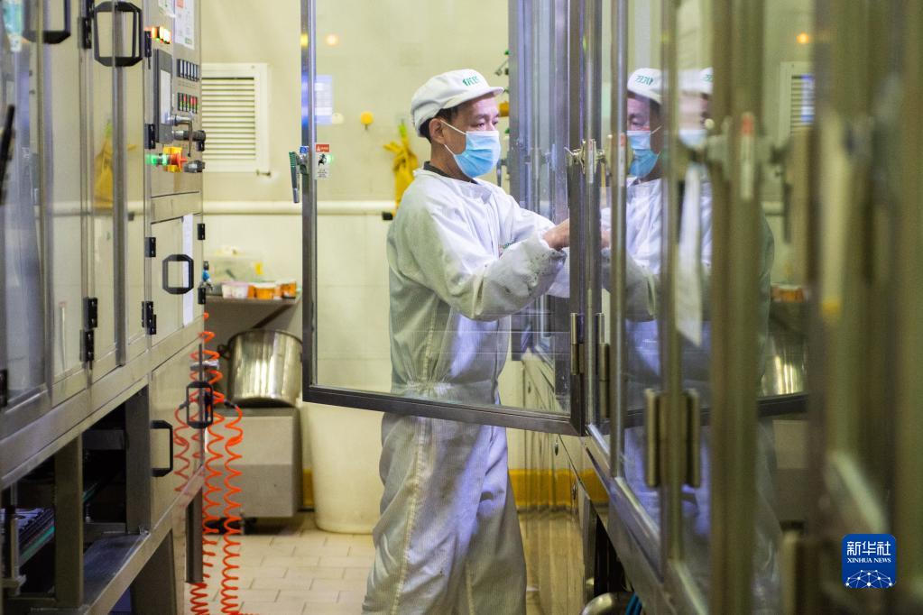 12月13日,在皇氏集團(tuán)湖南優(yōu)氏乳業(yè)有限公司飲品生產(chǎn)車間,工作人員在操作生產(chǎn)設(shè)備。