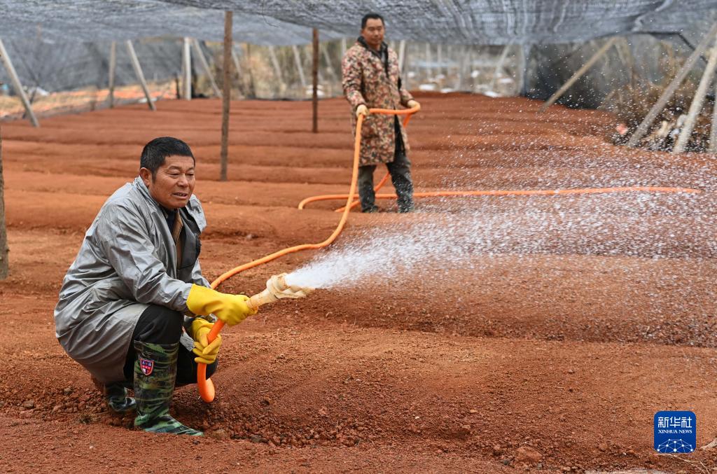 12月13日,村民在丹寨縣興仁鎮茶葉育苗基地給苗床澆水。