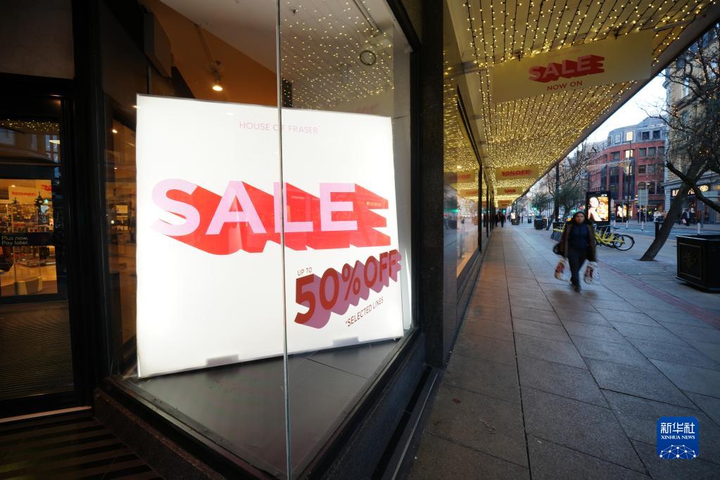 12月13日,一名女子走過英國曼徹斯特商鋪的促銷廣告。