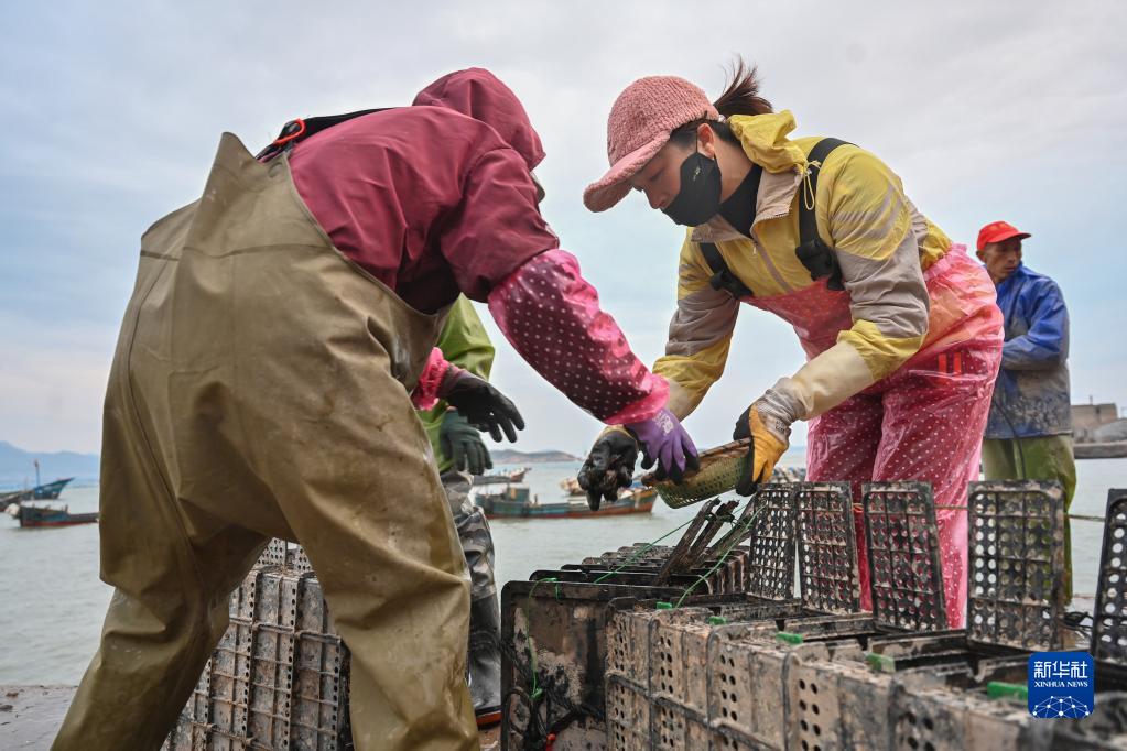 12月13日,在福建省連江縣后灣碼頭,村民在分裝鮑魚。