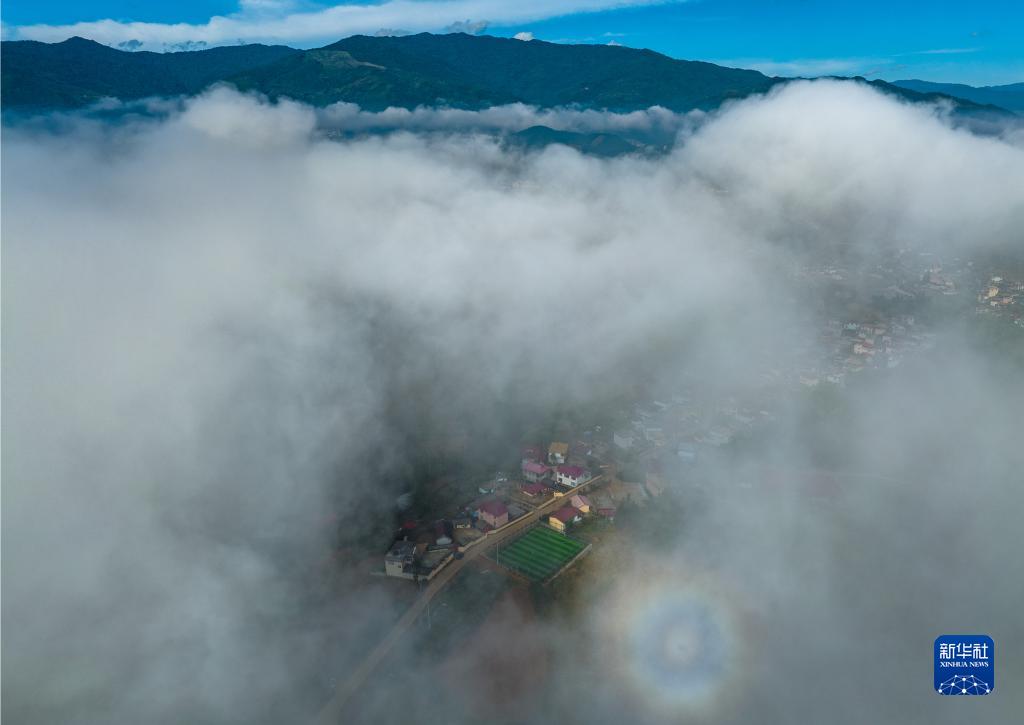 這是無人機拍攝的云霧間的云南省滄源佤族自治縣龍乃村足球場(12月8日攝)。