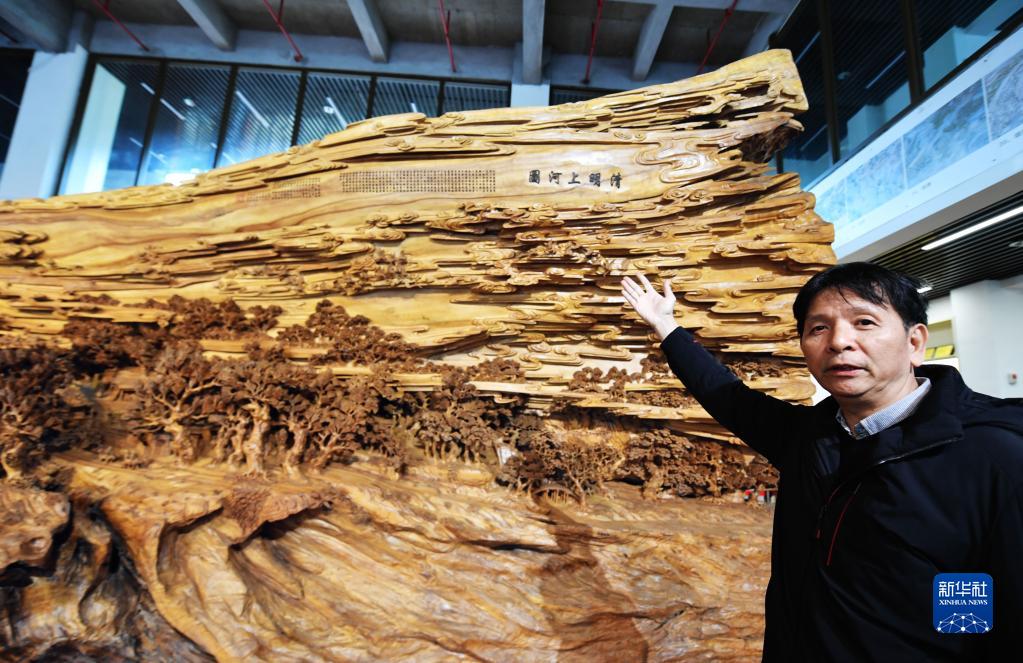 12月14日,國家級非遺項目莆田木雕省級代表性傳承人鄭春輝在介紹他的大型木雕作品《清明上河圖》。該件作品歷時近4年,在一棵長13米、最大直徑達3.5米的千年古樟木上雕刻而成。