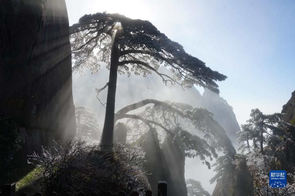 冬日清晨的黃山,陽光從玉屏峰和天都峰之間穿梭而來,透過迎客松的樹冠形成一道道光柱,胡曉春和李培生拍攝了這難得一見的美景,分享到各自的朋友圈。