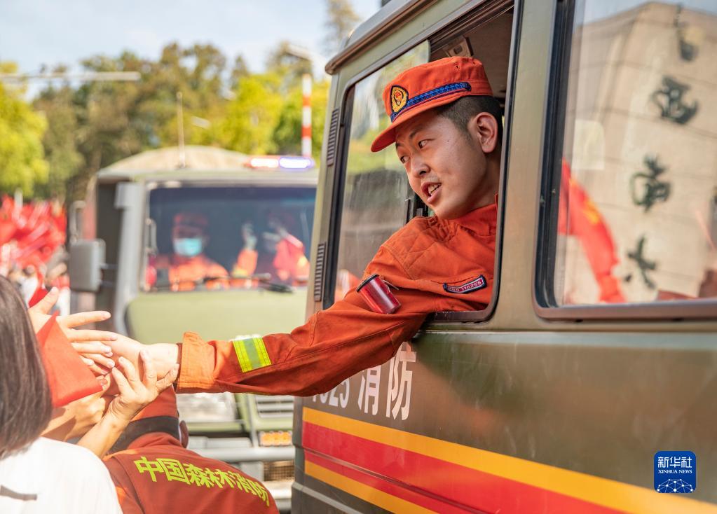 這是8月28日,在重慶市北碚區,參與山火撲救的云南森林消防隊員在完成任務撤離時與群眾握手道別。