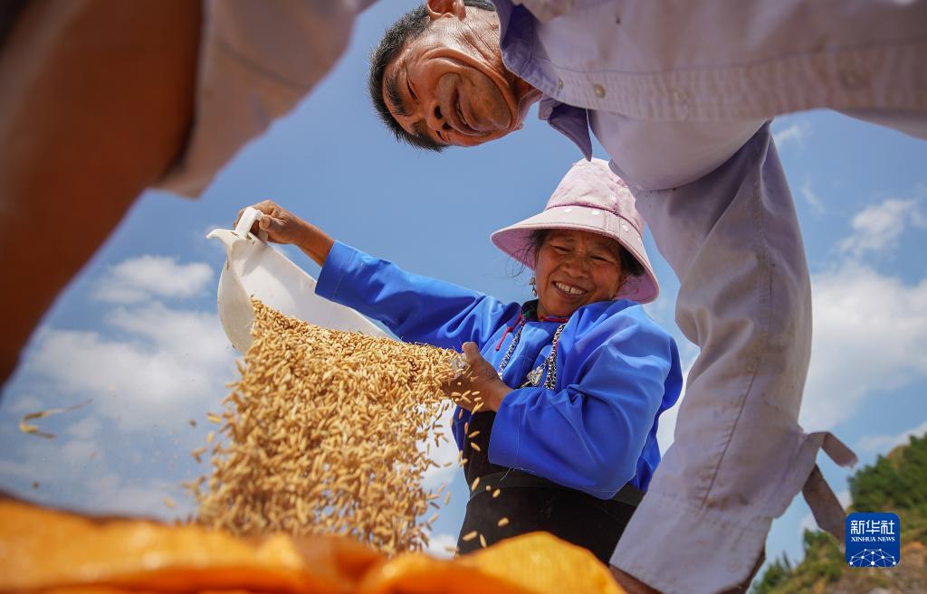 這是9月17日,在貴州省黔東南苗族侗族自治州丹寨縣金泉街道,村民將晾曬好的稻谷裝袋。