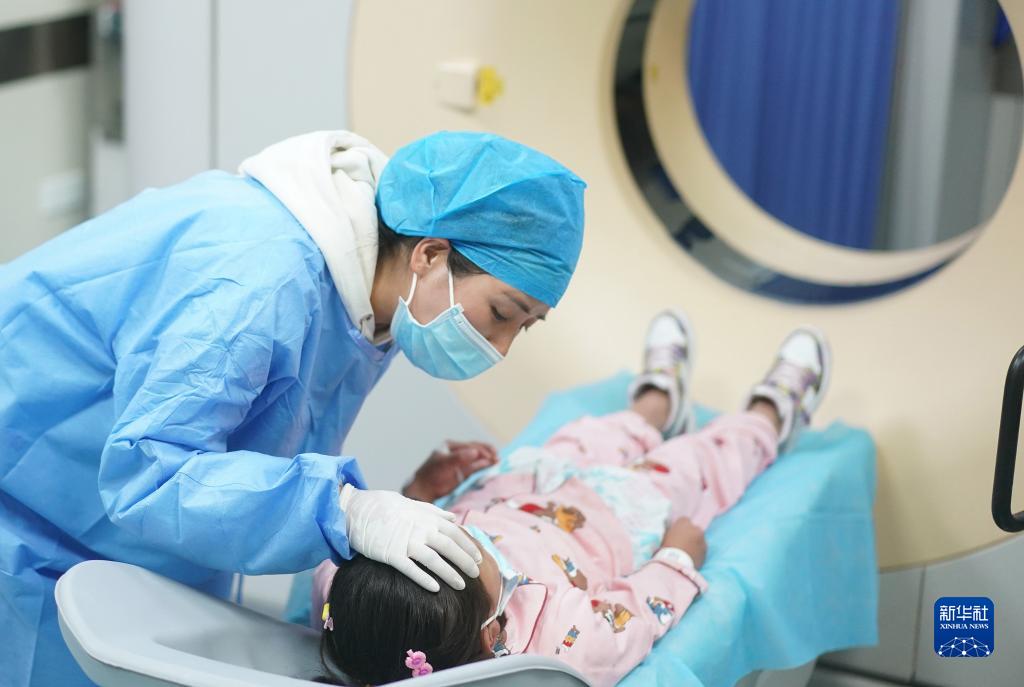 這是5月12日,在位于江蘇省南京市的南京醫(yī)科大學(xué)第二附屬醫(yī)院,護(hù)士安慰準(zhǔn)備接受CT增強(qiáng)檢查的西藏先天性心臟病小患者達(dá)瓦卓瑪。