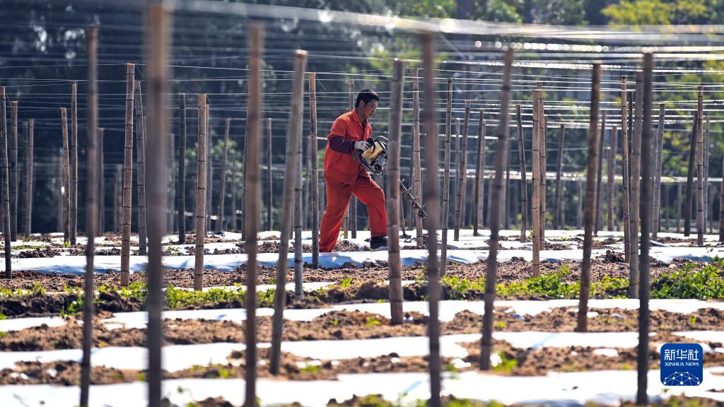 在欽州市三娘灣黃金百香果種植園,一名農(nóng)民在搭建黃金百香果苗架(12月14日攝)。