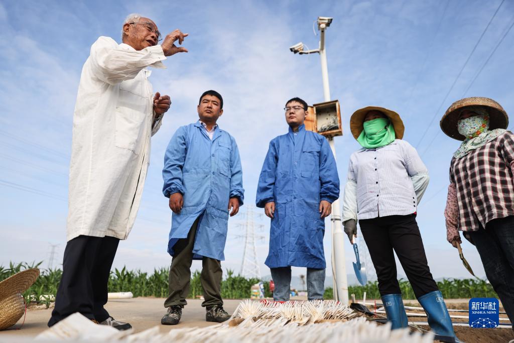 12月15日,玉米育種專家程相文(左一)在三亞南繁科研育種基地指導工人播種。