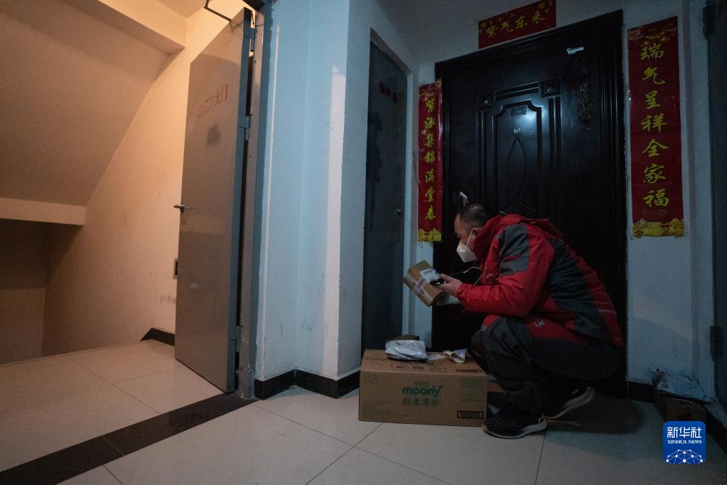在北京市大興區(qū)新源時代小區(qū),快遞小哥齊帥龍給不在家的客戶打電話(12月15日攝)。