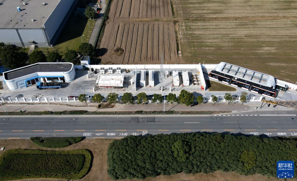 12月15日拍攝的位于臨港新城的一個氫能公交車加氣站(無人機照片)。