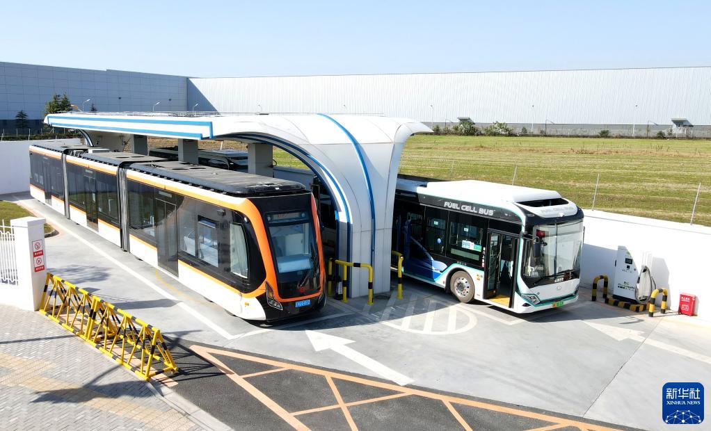 12月15日,一輛氫能中運量公交車(左)駛入氫能公交車加氣站加氣(無人機照片)。