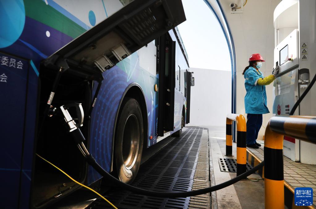 12月15日,一名工作人員操作加氣設備為氫能公交車加氣。