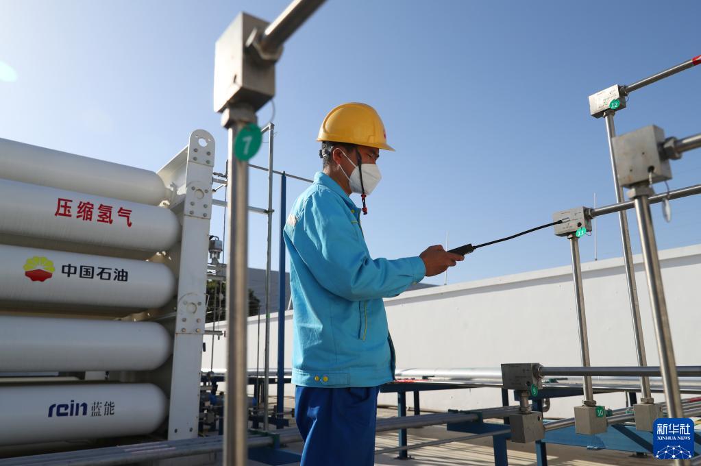 12月15日,一名工作人員在加氣站儲(chǔ)氫泵站內(nèi)使用氫探筆監(jiān)測(cè)設(shè)備密封狀況。
