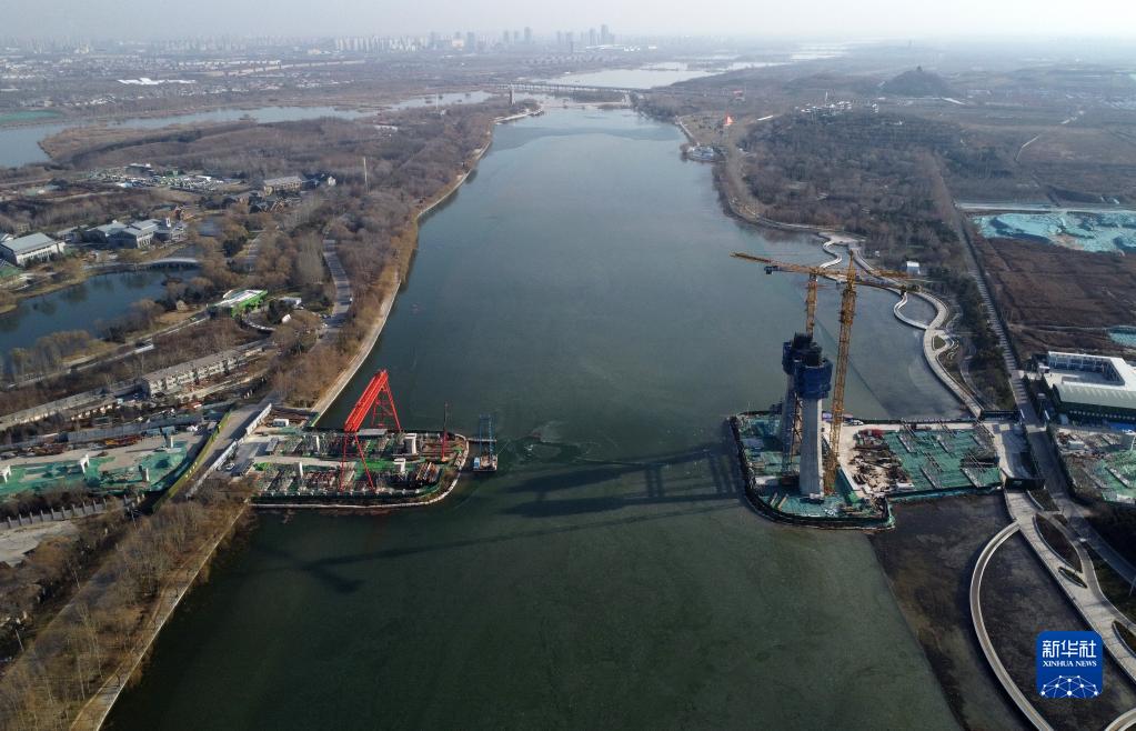 12月15日,工人在石家莊市太平河片區(qū)工程學(xué)府路東延跨太平河大橋建設(shè)工地施工(無人機(jī)照片)。