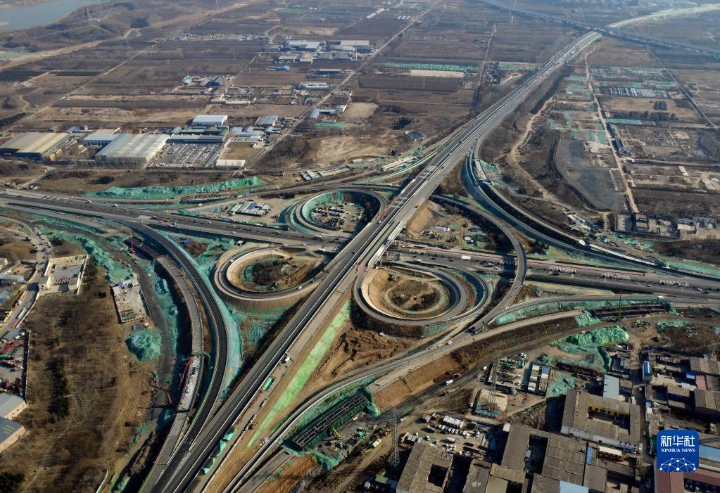 12月15日,工人在石家莊市北三環與復興大街互通工程建設工地施工(無人機照片)。