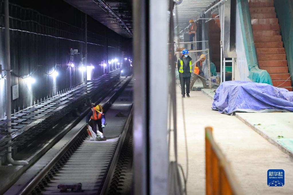 12月16日,中鐵五局建設者在貴陽軌道交通三號線東風鎮站內施工。