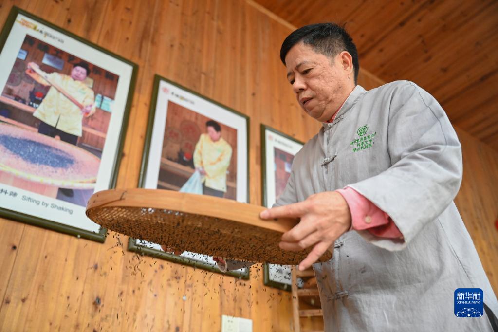 12月16日,在福州茉莉花茶制茶工坊,福州茉莉花茶傳統窨制工藝大師傅天甫進行制茶的第二道工序“抖”。“抖”是將茶葉分出曲直圓扁。